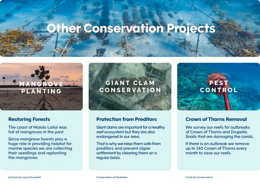 Plantation Island Resort on Malolo Lailai in Fiji has an outreach program connected to the coral restoration work of Corals for Conservation. I designed educational posters for this program that help tourists understand the challenges the reefs are facing.