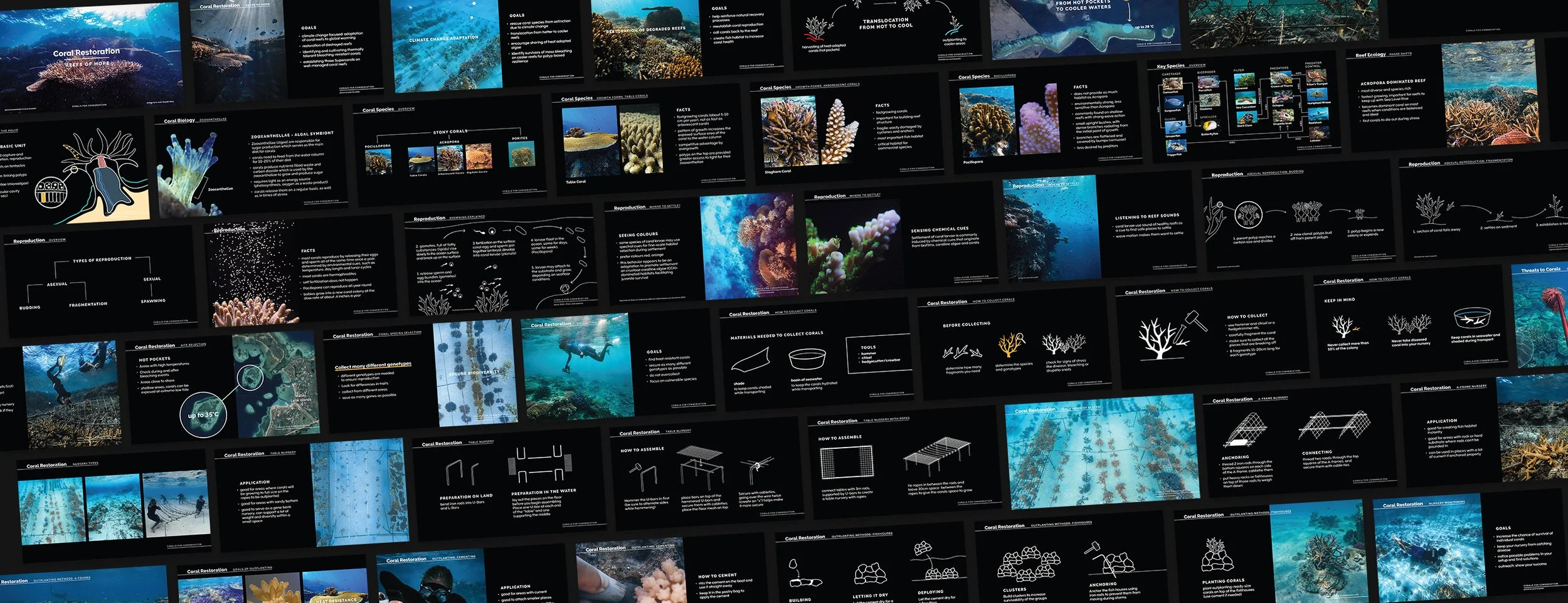 Working with marine biologists in the field and learning from them was a truly rewarding experience. The input I received was gathered in this presentation deck which can be used for coral restoration workshops worldwide. The Reefs of Hope initiative that implements those techniques was launched in 2023 by Dr. Austin Bowden-Kerby. Communities are regularly trained to protect and restore their local reefs with this slide deck which is expandable and grows as more knowledge is becoming available.